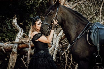 was het zover! De shoot vond plaats bij de Loonse en Drunense Duinen tijdens golden hour en toen ik mijn auto geparkeerd had op de parkeerplaats en de rest van de fotografen ontmoet had kwam ze daar aan, in vol ornaat: Miranda met haar Friese merrie Anna en wat een verschijning was dat! Grote, zwarte Anna met een prachtig robuust hoofdstel met Miranda in een prachtige zwarte jurk, donkere make-up, kekke laarzen en superstoere tatoeages en het plaatje was gewoonweg compleet 'Dark Queen' it is!